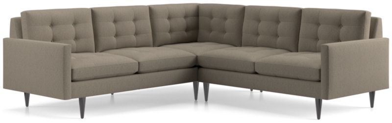 Now a Crate and Barrel classic, its pure 1960s aesthetic is scaled deep so you can sit firm and upright, but also slouch back in comfort. Well-suited to make a great impression, the menswear-inspired fabric tailors Petrie's sleek, boxy cushions and slim track arms with heathered color and soft texture. Here, we've paired the left arm corner sofa and right arm loveseat; you might also choose to add companion pieces from the Petrie Sectional Collection. The Petrie 2-Piece Corner Midcentury Sectional Sofa is a Crate and Barrel exclusive.