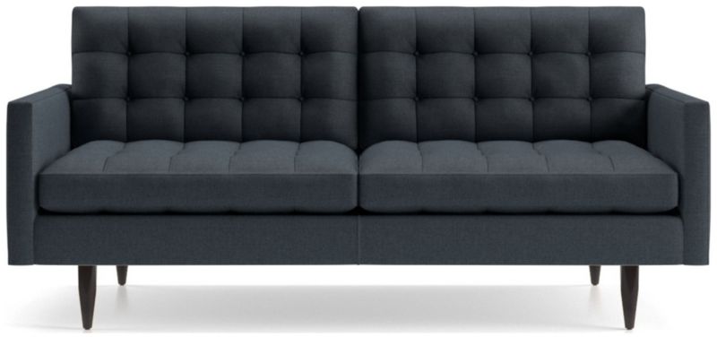 Now a Crate and Barrel classic, its pure 1960s aesthetic lets you sit deep firm and upright, but also slouch back in comfort. Scaled for apartment living, this compact sofa features sleek, boxy cushions and slim track arms that are tailored in menswear-inspired fabric with heathered color and soft texture. The Petrie Midcentury Apartment Sofa is a Crate and Barrel exclusive.