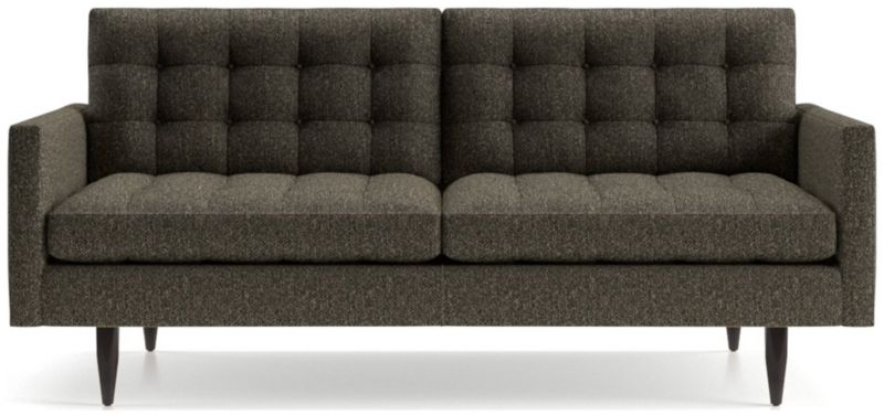 Now a Crate and Barrel classic, its pure 1960s aesthetic lets you sit deep firm and upright, but also slouch back in comfort. Scaled for apartment living, this compact sofa features sleek, boxy cushions and slim track arms that are tailored in menswear-inspired fabric with heathered color and soft texture. The Petrie Midcentury Apartment Sofa is a Crate and Barrel exclusive.