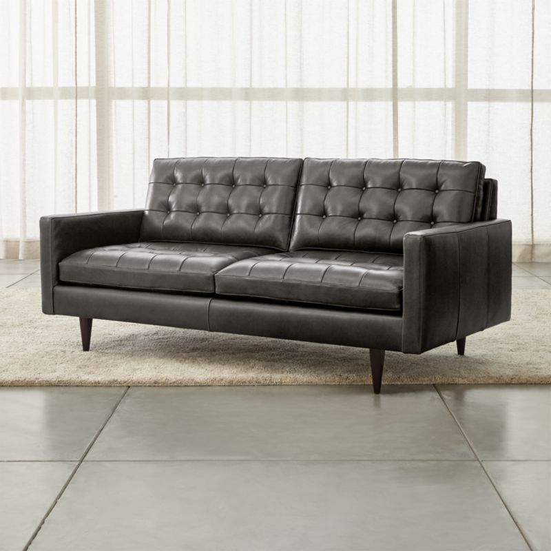 Petrie is a distinct leather living room sofa that sits at the intersection of mid-century and today, with clean lines, soft authentic leather and tailored cushions expertly button-tufted by hand. Now a Crate and Barrel classic, the pure 1960s aesthetic of this compact sofa scaled for apartment living lets you sit deep, firm and upright, but also slouch back in comfort. Sleek, boxy cushions and slim track arms look elegant and polished thanks to its supple, luxurious leather that will develop a beautiful, natural patina over time. Petrie Leather Midcentury Apartment Sofa is a Crate and Barrel exclusive.