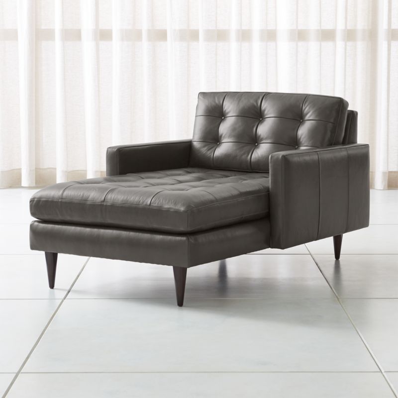 Positioned at the intersection of mid-century and today, the Petrie chaise impresses with its clean lines, soft leather and tailored cushions expertly button-tufted by hand. Now a Crate and Barrel classic, the chaise's pure 1960s aesthetic is scaled deep so you can sit firm and upright while stretching out in comfort. Sleek, boxy cushions and slim track arms look elegant and polished thanks to its supple, luxurious leather that will develop a beautiful, natural patina over time. The Petrie Leather Midcentury Chaise Lounge is a Crate and Barrel exclusive.
