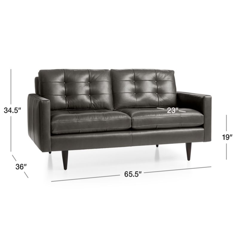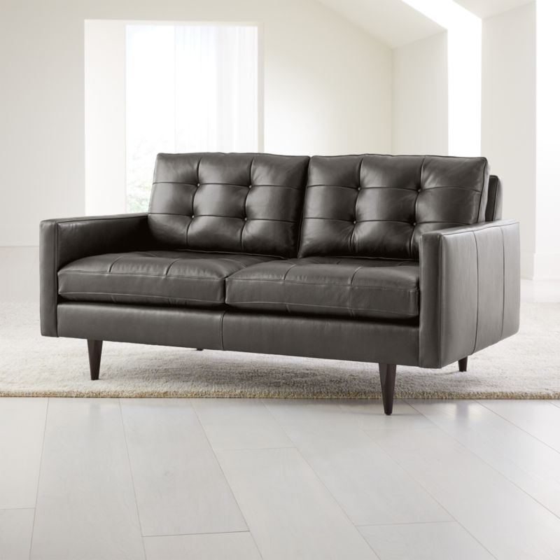 Petrie is a distinct leather living room sofa that sits at the intersection of mid-century and today, with clean lines, soft authentic leather and tailored cushions expertly button-tufted by hand. Now a Crate and Barrel classic, the pure 1960s aesthetic of this compact loveseat scaled for apartment living lets you sit deep, firm and upright, but also slouch back when you want a more relaxed seat. Sleek, boxy cushions and slim track arms look elegant and polished thanks to its supple, luxurious leather that will develop a beautiful, natural patina over time. Petrie Leather Midcentury Loveseat is a Crate and Barrel exclusive.