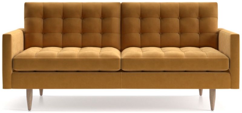 Now a Crate and Barrel classic, its pure 1960s aesthetic lets you sit deep firm and upright, but also slouch back in comfort. Scaled for apartment living, this compact sofa features sleek, boxy cushions and slim track arms that are tailored in menswear-inspired fabric with heathered color and soft texture. The Petrie Midcentury Apartment Sofa is a Crate and Barrel exclusive.