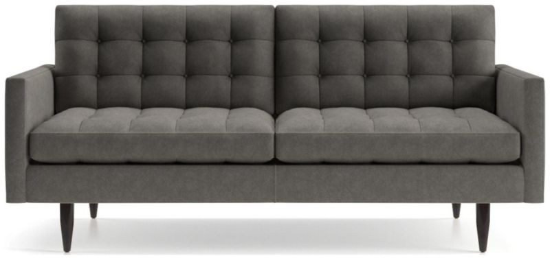 Now a Crate and Barrel classic, its pure 1960s aesthetic lets you sit deep firm and upright, but also slouch back in comfort. Scaled for apartment living, this compact sofa features sleek, boxy cushions and slim track arms that are tailored in menswear-inspired fabric with heathered color and soft texture. The Petrie Midcentury Apartment Sofa is a Crate and Barrel exclusive.