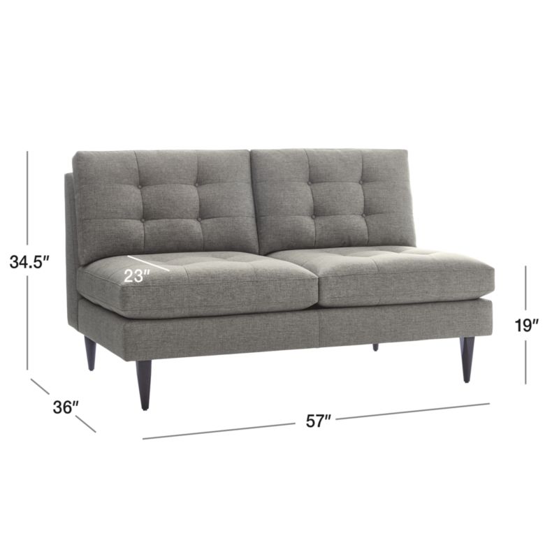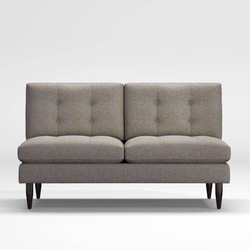 Now a Crate and Barrel classic, its pure 1960s aesthetic is scaled deep so you can sit firm and upright, but also slouch back in comfort. Well-suited to make a great impression, the menswear-inspired fabric tailors Petrie's sleek, boxy cushions with heathered color and soft texture. Easily create a custom sectional for your unique space by joining the armless loveseat with companion pieces from the Petrie Sectional Collection. The Petrie Midcentury Armless Loveseat is a Crate and Barrel exclusive.
