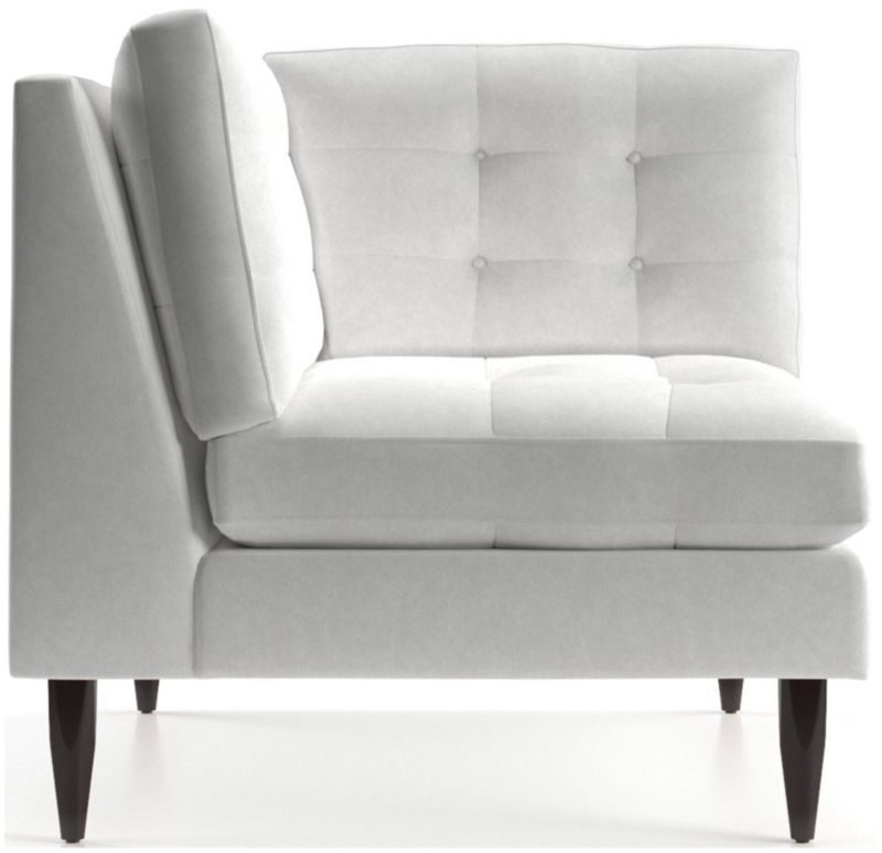 Now a Crate and Barrel classic, its pure 1960s aesthetic is scaled deep so you can sit firm and upright, but also slouch back in comfort. Well-suited to make a great impression, the menswear-inspired fabric tailors Petrie's sleek, boxy cushions and slim track arms with heathered color and soft texture. Easily create a custom sectional for your unique space by joining the corner chair with companion pieces from the Petrie Sectional Collection. Petrie Midcentury Corner Chair is a Crate and Barrel exclusive.