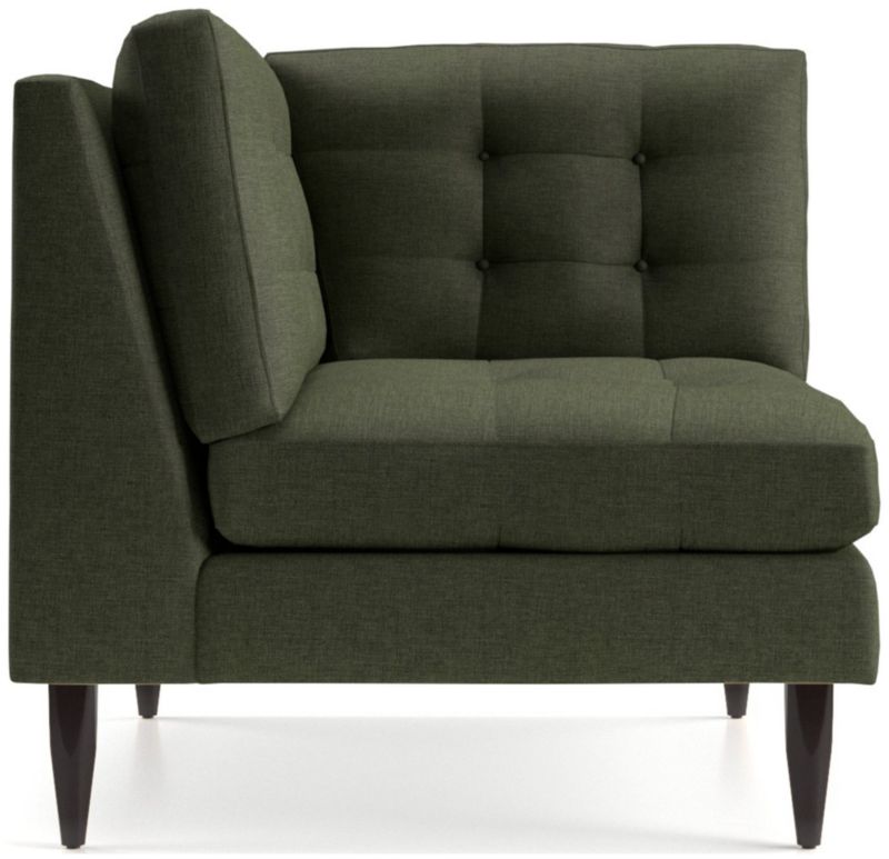 Now a Crate and Barrel classic, its pure 1960s aesthetic is scaled deep so you can sit firm and upright, but also slouch back in comfort. Well-suited to make a great impression, the menswear-inspired fabric tailors Petrie's sleek, boxy cushions and slim track arms with heathered color and soft texture. Easily create a custom sectional for your unique space by joining the corner chair with companion pieces from the Petrie Sectional Collection. Petrie Midcentury Corner Chair is a Crate and Barrel exclusive.