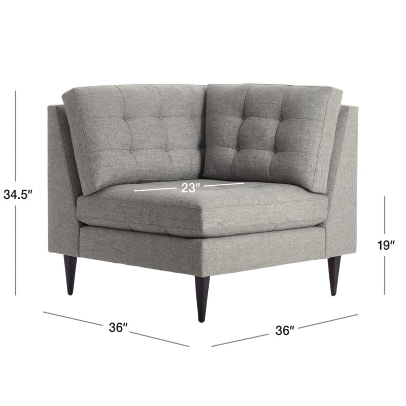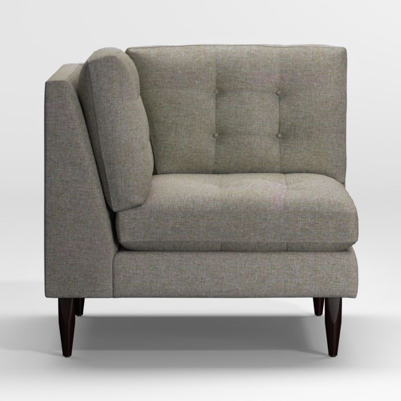 Now a Crate and Barrel classic, its pure 1960s aesthetic is scaled deep so you can sit firm and upright, but also slouch back in comfort. Well-suited to make a great impression, the menswear-inspired fabric tailors Petrie's sleek, boxy cushions and slim track arms with heathered color and soft texture. Easily create a custom sectional for your unique space by joining the corner chair with companion pieces from the Petrie Sectional Collection. Petrie Midcentury Corner Chair is a Crate and Barrel exclusive.