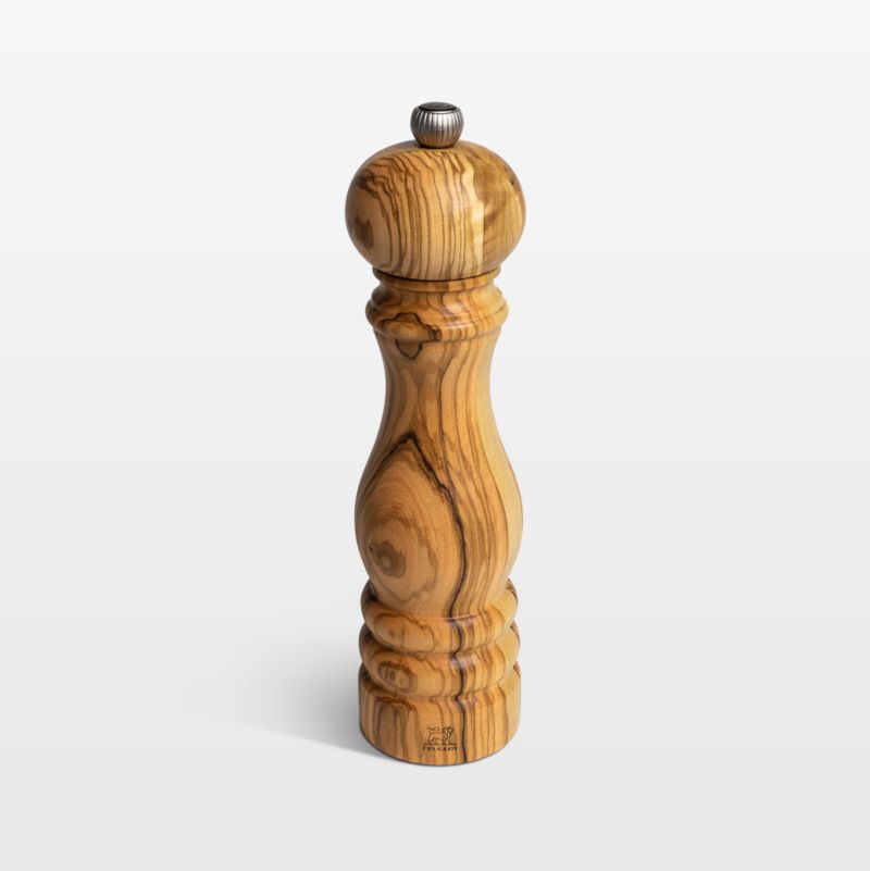 This striking pepper mill makes the most of olivewood's expressive grain with ornately turned curves. Each mill is crafted from a single piece of olivewood and finished with oil for a velvet-like touch. Turning the knob adjusts the size of the grind—clockwise for a finer grind, counterclockwise for coarser. Due to the characteristics of natural wood, the contrasting veining of each pepper grinder will be unique.