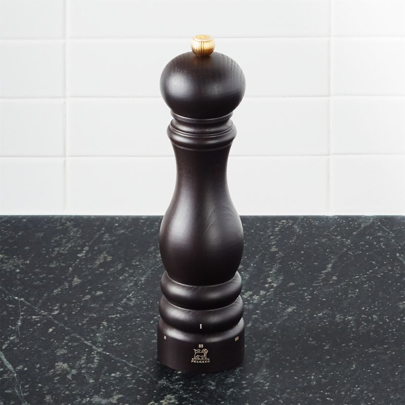Designed more than 30 years ago, this classically turned salt mill continues to grace professional and home kitchens. Topped with a golden nob marked with Peugeot's lion's head logo, the chocolate-finished wood mill fits well in hand, dispensing perfectly ground sea, kosher and specialty salts. Equipped with a steel grinding mechanism, the mill features six defined settings and an array of grind options in between. The two-stage grinding technology first shatters then grinds salt for professional results.