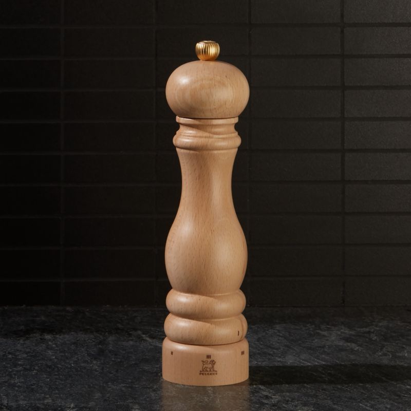 Designed more than 30 years ago, this classically turned pepper mill continues to grace professional and home kitchens. Topped with a golden nob marked with Peugeot's lion's head logo, natural wood mill fits well in hand, dispensing perfectly ground pepper. Thanks to its steel grinding mechanism, the mill offers six defined settings and also allows for an infinite array of grind options in between. The two-stage grinding technology first cracks then grinds pepper, releasing the full aroma of fresh peppercorns.