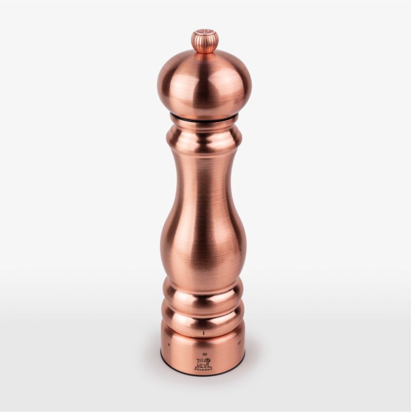 Designed more than 30 years ago, this classically turned salt mill continues to grace professional and home kitchens. The Unique line updates Peugeot's iconic Paris in stainless steel with a warm copper finish. Topped with a matching knob marked with Peugeot's lion's head logo, the mill fits well in hand, dispensing perfectly ground salt. The carbon steel grinding mechanism offers six defined settings.