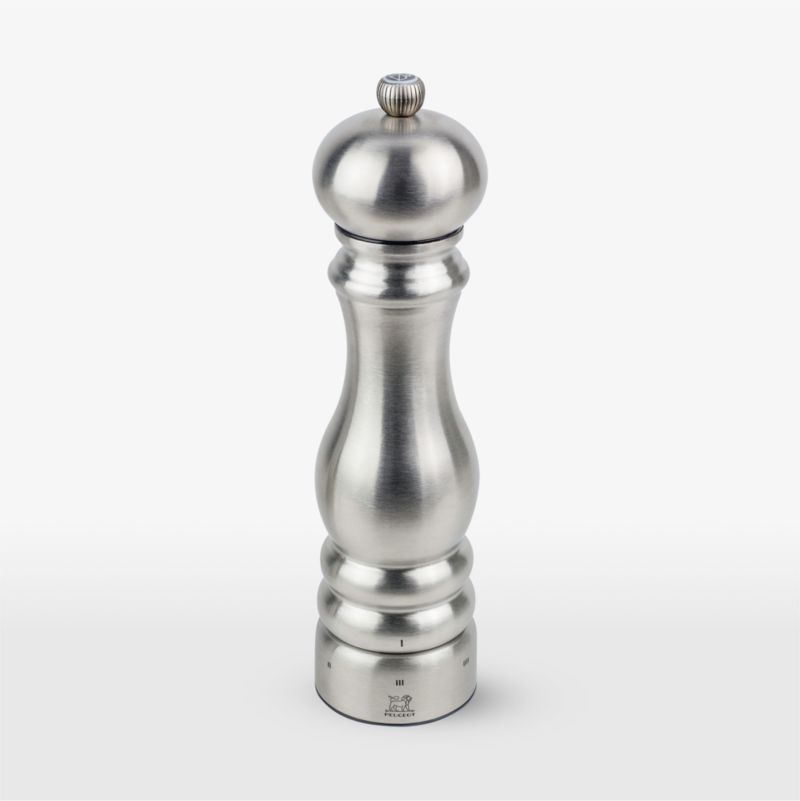 Designed more than 30 years ago, this classically turned salt mill continues to grace professional and home kitchens. The Unique line updates Peugeot's iconic Paris in shining stainless steel. Topped with a matching knob marked with Peugeot's lion's head logo, the mill fits well in hand, dispensing perfectly ground salt. The carbon steel grinding mechanism offers six defined settings.