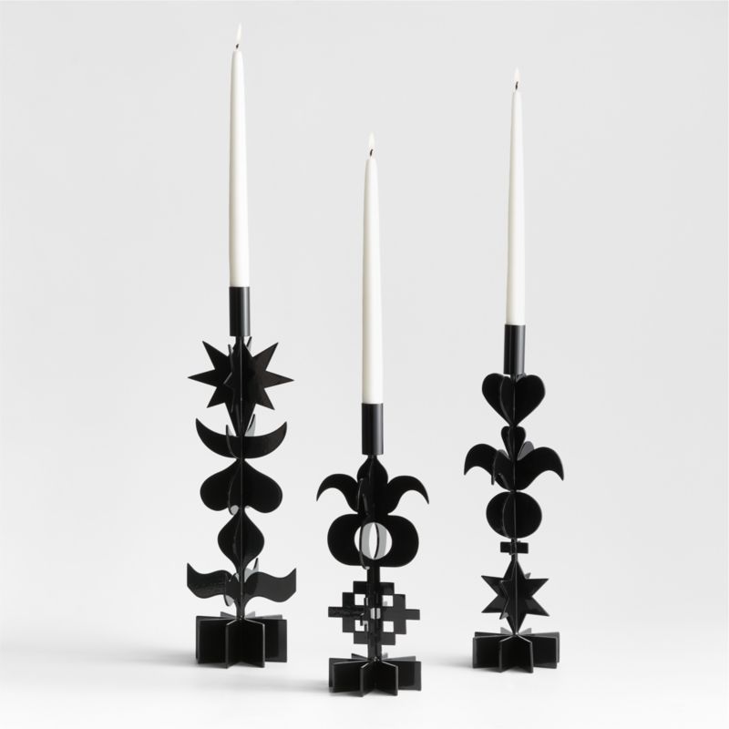 Paired stars, moons, hearts and other graphic shapes drawn from Lucia Eames's paper sculptures are reenvisioned as iron candle holders. Made of black-finished sheet iron that's laser cut, welded and hand finished, the taper candle holders come in three sizes to illuminate your space with Lucia Eames's magical designs.