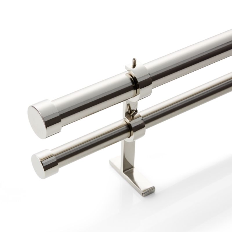 Our two-tier curtain rod set hangs both panels and sheers for a layered look, adjusting easily to your preferred levels of light and privacy. This exclusive set includes two telescoping rods finished with sleek cylindrical end caps, elegantly angular double brackets and mounting hardware, all in gleaming polished nickel. Finish the look with our polished nickel curtain rings and tiebacks for a modern window with plenty of shine.