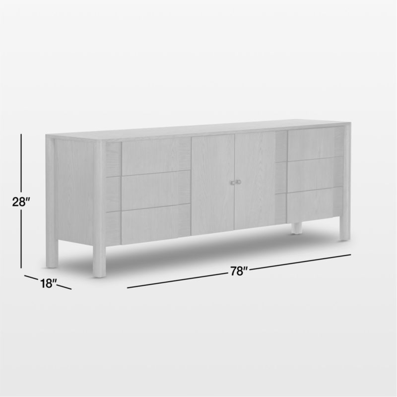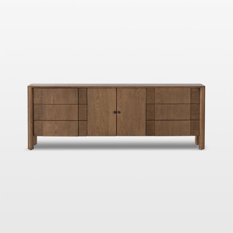 Maximum storage with maximum style, our Pollard media console meets the eye with dimensional detailing and the beautiful grain of oak veneer. Recessed sides let the two sets of drawers play with space, with the raised portions lying on the same plane as the flat fronts of the central double-doored cabinet. Bullnose edges on the waterfall frame contrast with curving contours. Inside, the console provides one adjustable shelf for concealed storage of living room essentials.