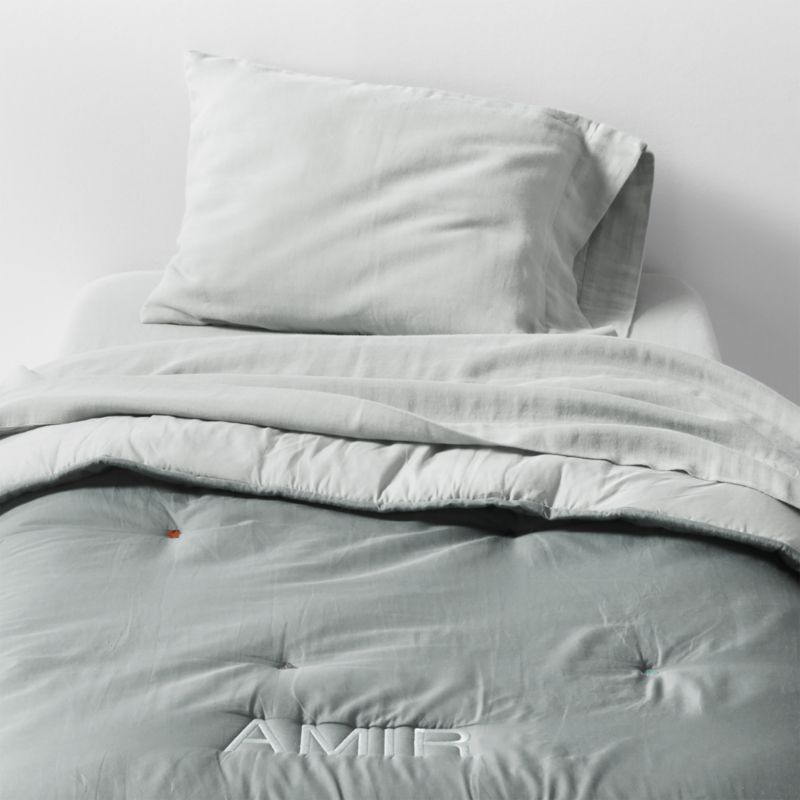 Stitched geometric shapes in bright pops of color give our comforter a sophisticated yet playful look. Embroidered in warm hues of savannah yellow, terracotta, pine green, brulee brown and smoke blue, the all-over pattern pops against the deep indigo comforter, which reverses to a solid mist blue. The comforter is made of airy and lightweight organic cotton voile, designed to feel as comfy and cozy as your kid's favorite puffy jacket. Pair the comforter with any of the coordinating colors from our toddler bedding collections.