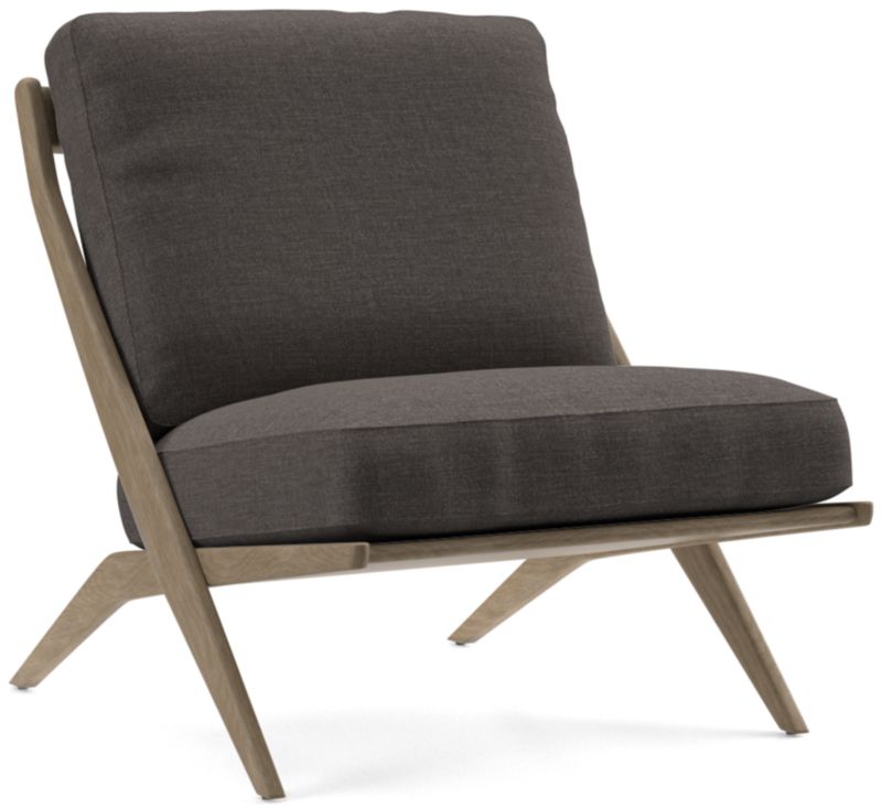 The classic slipper chair takes on mid-century vibes in our Pose chair. The solid ash frame tilts back with cantilever angles for a comfortable recline, showcasing the wood's beautiful grain washed in warm grey. Clean-lined seat and back box cushions offer just the right mix of fiber and down for a comfortable yet supportive sit, while the linen-like upholstery layers on soft, touchable texture. The Pose grey wash accent chair is a Crate & Barrel exclusive.