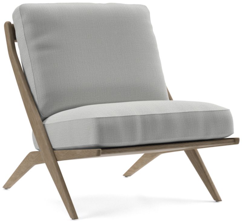 The classic slipper chair takes on mid-century vibes in our Pose chair. The solid ash frame tilts back with cantilever angles for a comfortable recline, showcasing the wood's beautiful grain washed in warm grey. Clean-lined seat and back box cushions offer just the right mix of fiber and down for a comfortable yet supportive sit, while the linen-like upholstery layers on soft, touchable texture. The Pose grey wash accent chair is a Crate & Barrel exclusive.