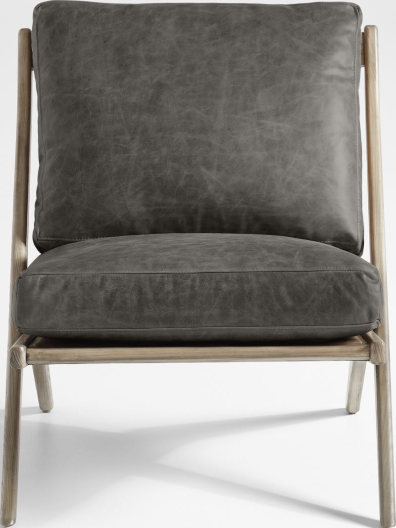 The classic slipper chair takes on mid-century vibes in our Pose chair. The solid ash frame tilts back with cantilever angles for a comfortable recline, showcasing the wood's beautiful grain with a grey wash finish. Clean-lined seat and back box cushions are upholstered in sumptuous leather, finished with wax and oil to bring out the natural texture and create an irresistibly soft hand. The Pose leather accent chair is a Crate & Barrel exclusive.
