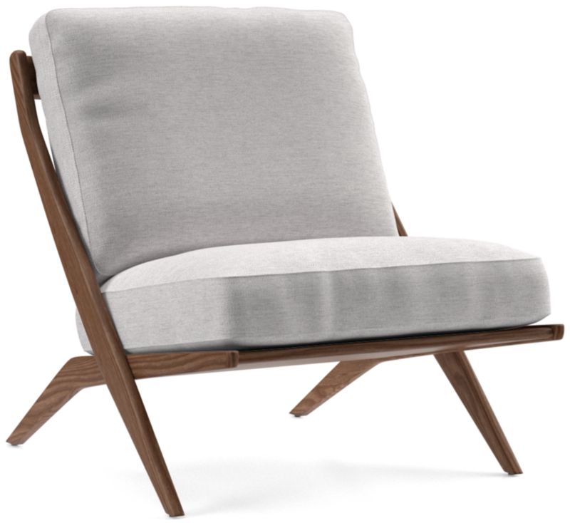 The classic slipper chair takes on mid-century vibes in our Pose chair. The solid ash frame tilts back with cantilever angles for a comfortable recline, showcasing the wood's beautiful grain and natural color. Clean-lined seat and back box cushions offer just the right mix of fiber and down for a comfortable yet supportive sit, while the linen-like upholstery layers on soft, touchable texture. The Pose natural accent chair is a Crate & Barrel exclusive.