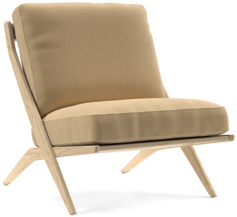 The classic slipper chair takes on mid-century vibes in our Pose chair. The solid ash frame tilts back with cantilever angles for a comfortable recline, showcasing the wood's beautiful grain and natural color. Clean-lined seat and back box cushions offer just the right mix of fiber and down for a comfortable yet supportive sit, while the linen-like upholstery layers on soft, touchable texture. The Pose natural accent chair is a Crate & Barrel exclusive.