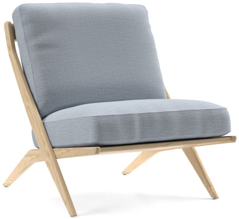 The classic slipper chair takes on mid-century vibes in our Pose chair. The solid ash frame tilts back with cantilever angles for a comfortable recline, showcasing the wood's beautiful grain and natural color. Clean-lined seat and back box cushions offer just the right mix of fiber and down for a comfortable yet supportive sit, while the linen-like upholstery layers on soft, touchable texture. The Pose natural accent chair is a Crate & Barrel exclusive.