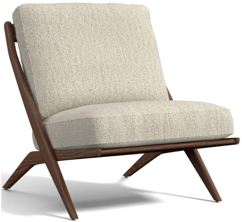 The classic slipper chair takes on mid-century vibes in our Pose chair. The solid ash frame tilts back with cantilever angles for a comfortable recline, showcasing the wood's beautiful grain and natural color. Clean-lined seat and back box cushions offer just the right mix of fiber and down for a comfortable yet supportive sit, while the linen-like upholstery layers on soft, touchable texture. The Pose natural accent chair is a Crate & Barrel exclusive.