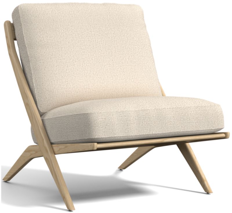 The classic slipper chair takes on mid-century vibes in our Pose chair. The solid ash frame tilts back with cantilever angles for a comfortable recline, showcasing the wood's beautiful grain and natural color. Clean-lined seat and back box cushions offer just the right mix of fiber and down for a comfortable yet supportive sit, while the linen-like upholstery layers on soft, touchable texture. The Pose natural accent chair is a Crate & Barrel exclusive.