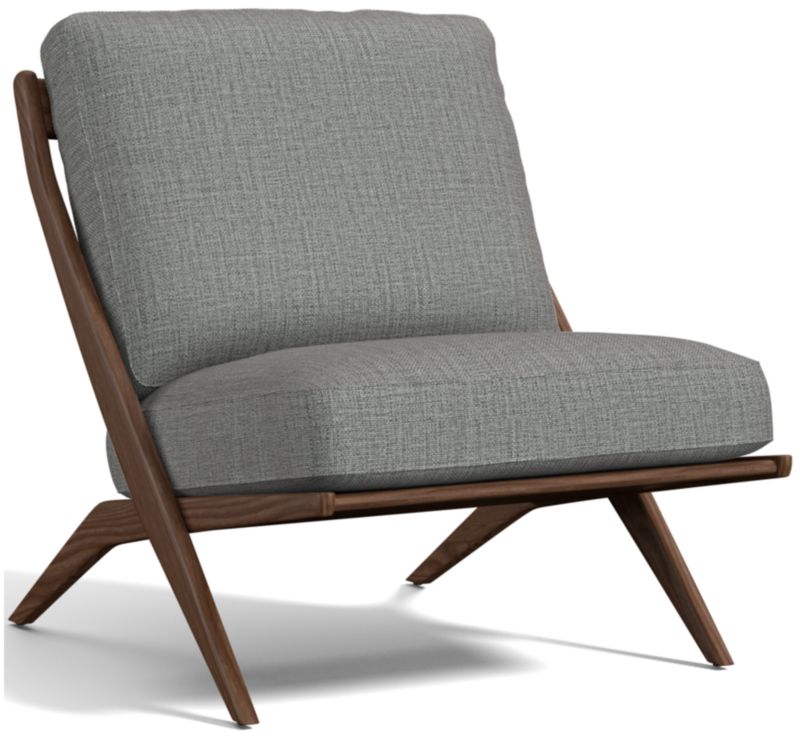 The classic slipper chair takes on mid-century vibes in our Pose chair. The solid ash frame tilts back with cantilever angles for a comfortable recline, showcasing the wood's beautiful grain washed in warm grey. Clean-lined seat and back box cushions offer just the right mix of fiber and down for a comfortable yet supportive sit, while the linen-like upholstery layers on soft, touchable texture. The Pose grey wash accent chair is a Crate & Barrel exclusive.