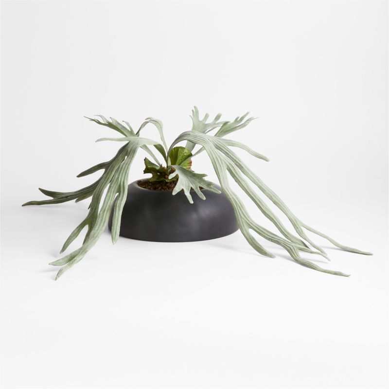 Lush, lifelike and unparalleled in quality, our faux staghorn fern brings vibrant plant energy to your wall. The sculptural, sweeping fern is potted in a ceramic pot with a unique reactive black glaze. Faux peat moss completes the realistic look. We love this faux staghorn mounted on its own above a fireplace or console table, or as part of an eclectic gallery wall.