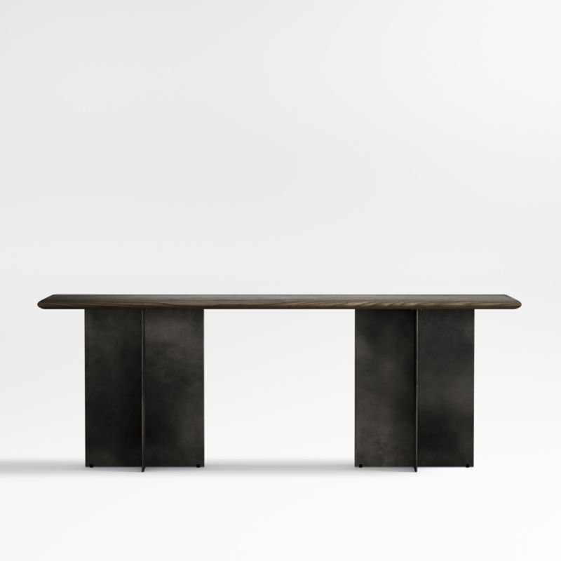Preto captivates with strong lines and a fresh mix of materials. Mitered planes of blackened steel stress the vertical, intersecting to form the console table's X-shaped legs. A rectangular ash top complements modern, industrial aesthetic with a ebonized finish, while pillowed edges counterpoint with soft curves. Amp up Preto's impact by adding the coordinating coffee or end table (sold separately).