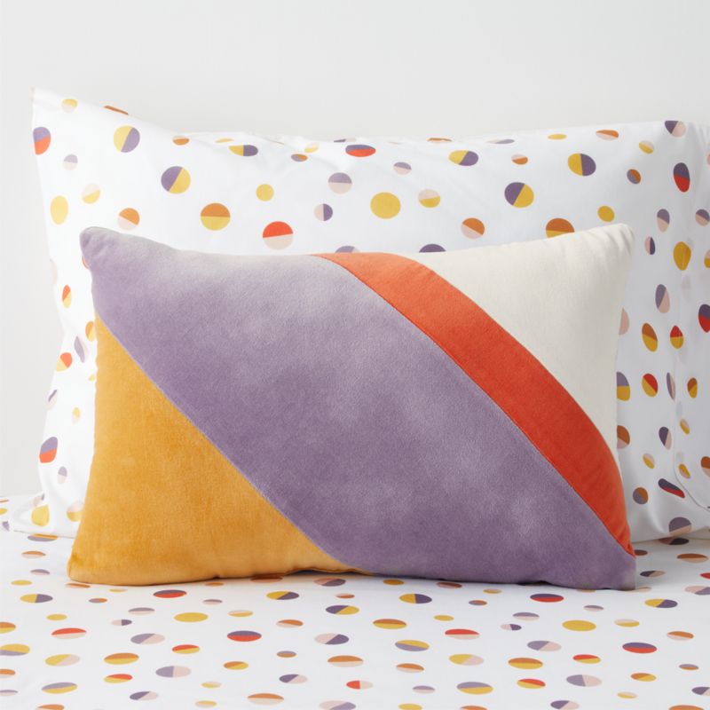 Colorful striped bands go on the diagonal to cozy up kids rooms and shared family spaces with our plush and graphic throw pillow. The rectangular pillow is sewn of exceptionally soft yet durable cotton velvet for a wow-worthy accent with irresistible texture and elevated style. The combination of purple, red, yellow and white makes the pillow a cinch to mix in with existing decor.