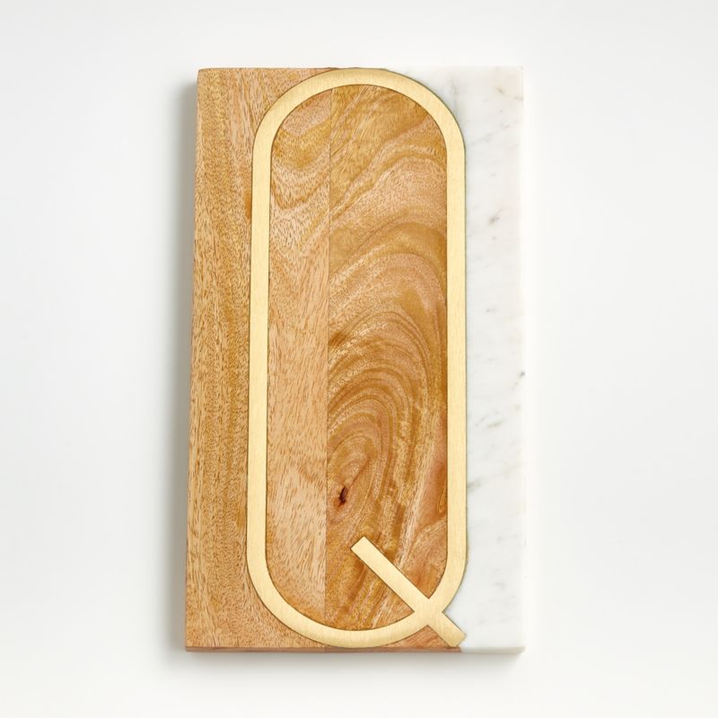 Serve charcuterie and crudités with a personal touch on this stunning monogrammed serving board. Composed of gorgeous mango wood and white marble, the board boldly spells out the oversized letter "Q" with gleaming inlaid brass in a crisp, modern font. Talented artisans carve, inlay and finish each board by hand, creating an extra-special wedding or housewarming gift. Due to the natural materials and handcrafted techniques, each monogrammed serving board is unique.