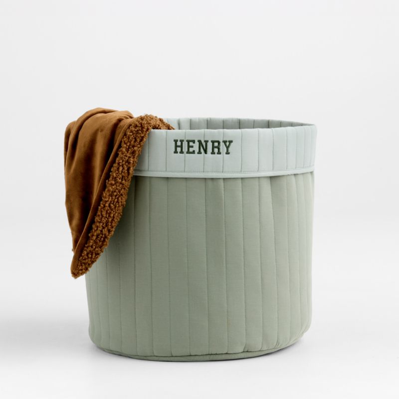 Our quilted storage bin keeps kid spaces feeling cozy and collected. Made from organic cotton with a subtle kantha-style quilting pattern, it has a light fill that gives the sides a gentle dimensional puff. The fold-over cuff reveals a tonal contrast lining that's just right for monogramming, making each bin feel personal and special. It's one easy, comfy catchall for toys, books or the day's big adventures.