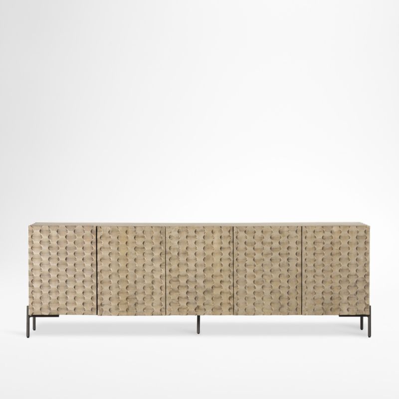 A carved honeycomb pattern wraps Raffael's grey-washed exterior in conversation-sparking texture and dimension. Crafted of renewable solid mango wood, from trees no longer producing fruit, each facet of the intricately carved door fronts highlights the wood's lively grain. Set on a minimalist base of gunmetal-finished iron, the console makes a sculptural addition to a living or family room. Raffael's seamless façade features two doors that open to three fixed shelves that house media components or provide storage.