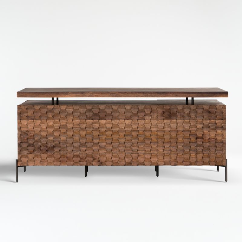 Our Raffael desk puts its best face forward with a beehive-like pattern intricately carved into its mango wood facade. Tinted warm brown, the carving brings out the dark and light tones of the richly grained wood for a sculptural presence that begs to be seen front and center in the home office. Slim gunmetal-finished supports float the desk's top tier and lift the desk off the floor in light contrast to the dark wood frame. Seamless doors flank the recessed chair space, opening to one fixed shelf each.