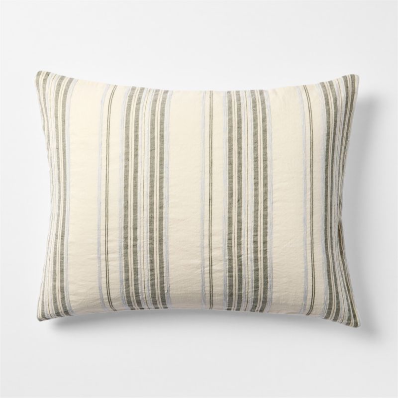 Textural stripes in a coastal-cool palette give our pillow sham a breezy, liveable feel we love. Yarn-dyed sage green and misty blue, the raised ticking stripes harmonize effortlessly with the natural cotton-linen ground. The subtly asymmetrical pattern enhances the sham's laid-back, beachy appeal, while the airy fabric drapes gracefully and sleeps comfortably year-round. Complete the look with the matching duvet cover and any of our coordinating shadow sage, mist blue or naturally beautiful undyed sheets.
