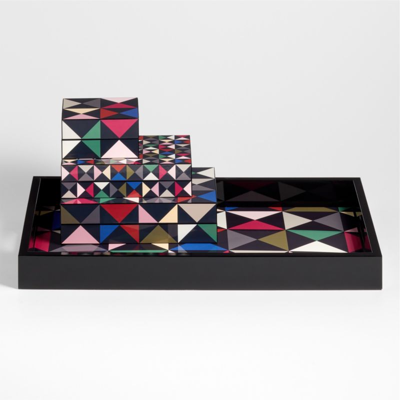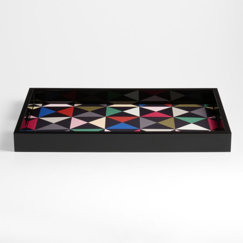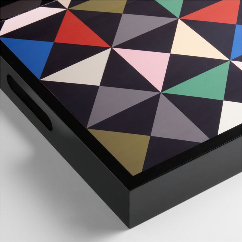 A striking midcentury graphic, this tray's geometric motif from the Eames portfolio tiles triangles in black and vibrant colors from the designers' classic palette. A high-shine lacquer finish on the wood tray highlights the rich black and high-key colors, and cutout handles make it easy transport. We love the tray's timelessly modern and sophisticated look, perfect for your coffee station, bar cart or cocktail table.