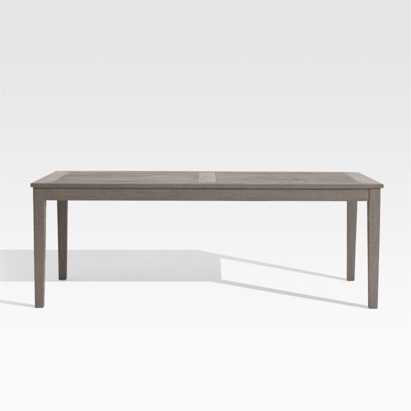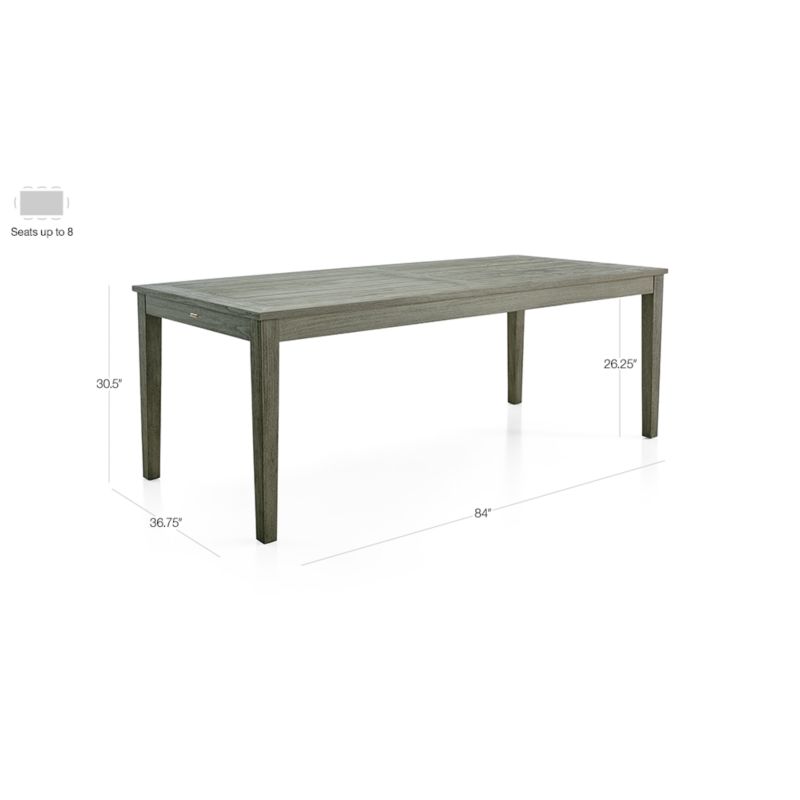 Our exclusive Regatta outdoor dining table cuts a clean, classic profile in a bold wide-slat design. Certified by the Forest Stewardship Council (FSC ®), the environmental gold standard, this Grade A plantation-grown teak is the highest quality teak in the world. Tinted grey to give it the silvery look of weathered teak, the table seats eight. We recommend protecting your Regatta piece when not in use with one of our outdoor covers, as painted wood is prone to peel and fade over time when exposed to the elements. The Regatta Grey Wash Rectangular Dining Table is a Crate & Barrel exclusive.