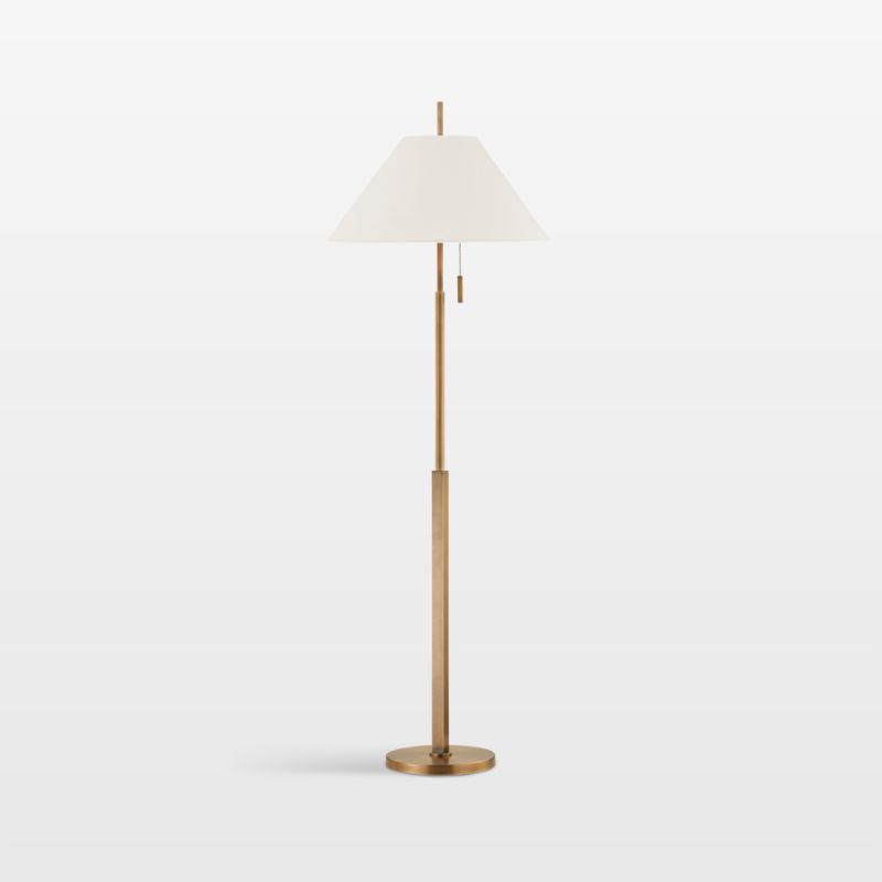 Well-tailored and timeless, the Reine floor lamp is a graceful study in geometry. A round plate grounds the lamp, supporting a squared-off base that elevates the round pole. The conical white linen shade filters light softly so it gleams beautifully off the warm brass. Upright and elegant, the elegant lamp casts useful light near a reading chair, sofa or chaise.