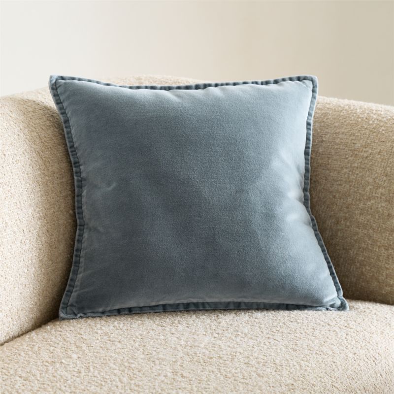 Elevated yet low-key, refined but relaxed. Our exclusive pillow collection reimagines velvet for everyday luxury—casual, comfortable and chic. The washed finish has a modern matte look, while the dyeing process creates subtle variations in the dusty blue hue. Softly finished with flange tailoring, the organic cotton pillow looks right year-round tossed on your sofa, armchair or bed. The square pillow includes your choice of a plush feather-down or lofty down-alternative insert.