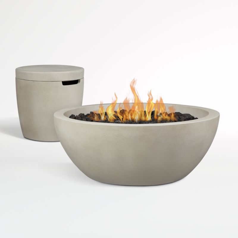 On cool days and chilly nights, this ultra-modern fire bowl draws you outdoors with the warmth, fascination and irresistibility of flickering flames. Balancing industrial and organic beauty, concrete curves a clean-lined bowl filled with black lava rocks. The molded, glass-reinforced concrete gives the propane-fueled outdoor fireplace strength and durability. The firepit's brass burner system uses eight jets to create rich, inviting flames everyone will want to gather around. The coordinating round cover with easy-access lid conceals the propane tank (not included) while serving double duty as a side table.