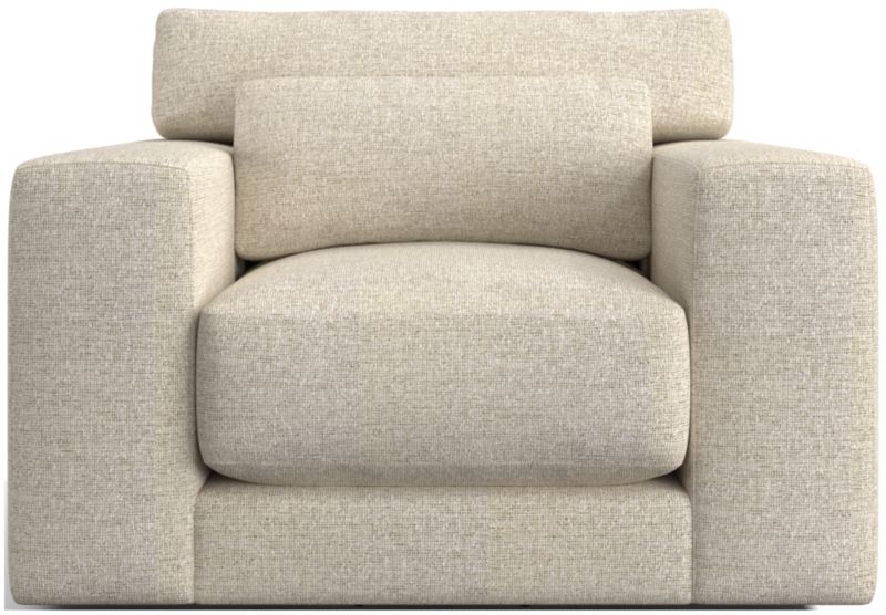Years in the making, we pulled in customer-favorite design elements to create Retreat, a plush new hangout spot with a clean, modern look. The swivel chair has a soft-yet-supportive seat cushion and a lumbar pillow that removes for a deeper, more loungey sit. Extra-wide arms provide a spot to park a book, tablet or bowl of popcorn, and a T-shaped back cushion snuggles in nicely to keep the look clean and current. Textural and forgiving, the upholstery fabric we love is Serene—a bleach-cleanable, family-friendly sculpted weave that reads timeless and contemporary.