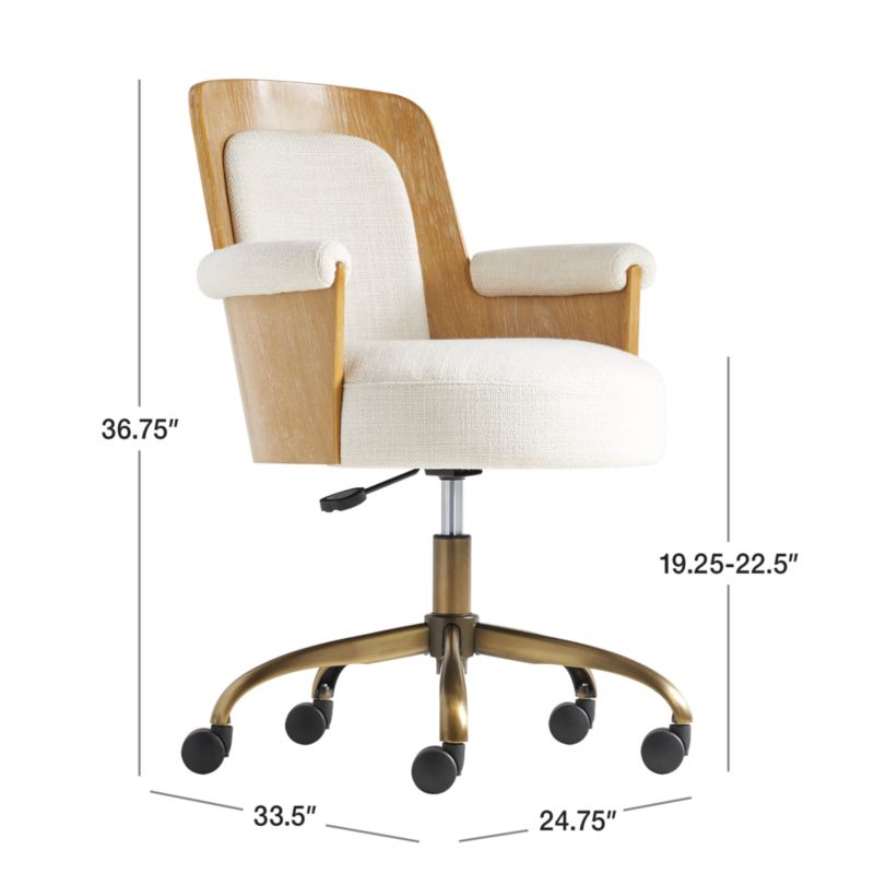 Honey-hued cerused white oak curves a barrel seat upholstered in linen-like ivory fabric in this mixed-material take on the office chair. Popular in Art Deco furniture, the ceruse method of finishing wood uses a pigmented wax to set off the grain against the stain. The coziness of the plush seat, supportive back pad and armrest bolsters balance the wood's firm arc. With its brass finish, the iron base complements the warmly hued oak and fabric, while five wheels navigate your home office with ease. Our Roan office chair is a Crate and Barrel exclusive.