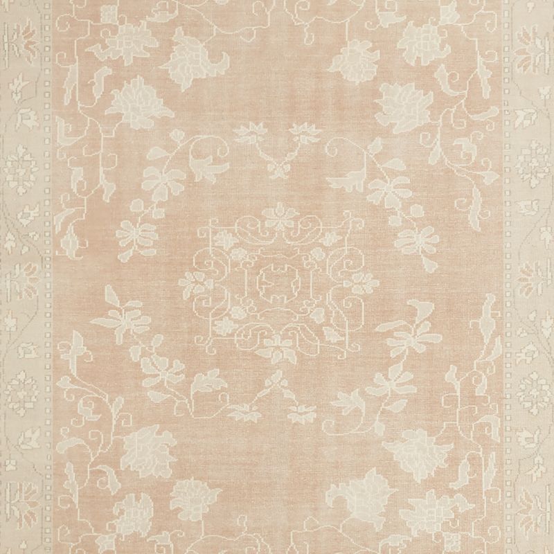 Our exclusive Rochelle rug emulates the exquisitely worn-in patina of an heirloom with a fresh, modern look. Knotted entirely by hand in a traditional process that can take multiple artisans up to 40 days, the rug weaves a traditional floral pattern in a modern palette. Wool in muted shades of sandy beige, cream and peach with subtle fading offers softness and durability, while a bit of viscose contributes sophisticated sheen. The Rochelle area rug makes an elegant foundation for your dining room or bedroom.