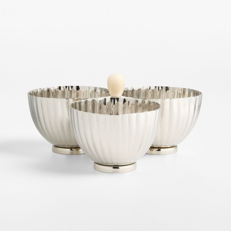 Romeo barware elevates every sip and snack with vintage-inspired elegance. Made of stainless steel with a polished finish, the server joins three bowls sculpted with fluted ribbing. A marbled resin knob adds understated drama and makes it easy to carry. Fill the three-part server with nuts, olives or candies for sophisticated snacking.