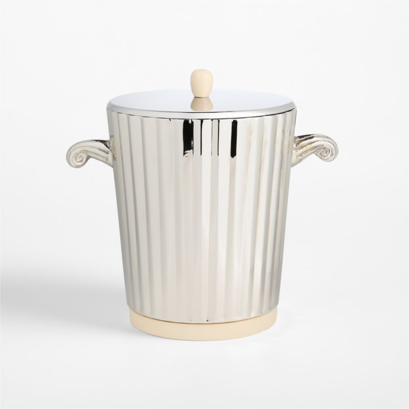 Romeo barware elevates every sip and snack with vintage-inspired elegance. Made of stainless steel with a polished finish, the ice bucket sparkles with fluted ribbing and scrolled handles reminiscent of antique artifacts. A marbled cream resin base and lid knob adds color and material contrast. Double-walled construction keeps ice chilled for hours as it keeps condensation at bay.