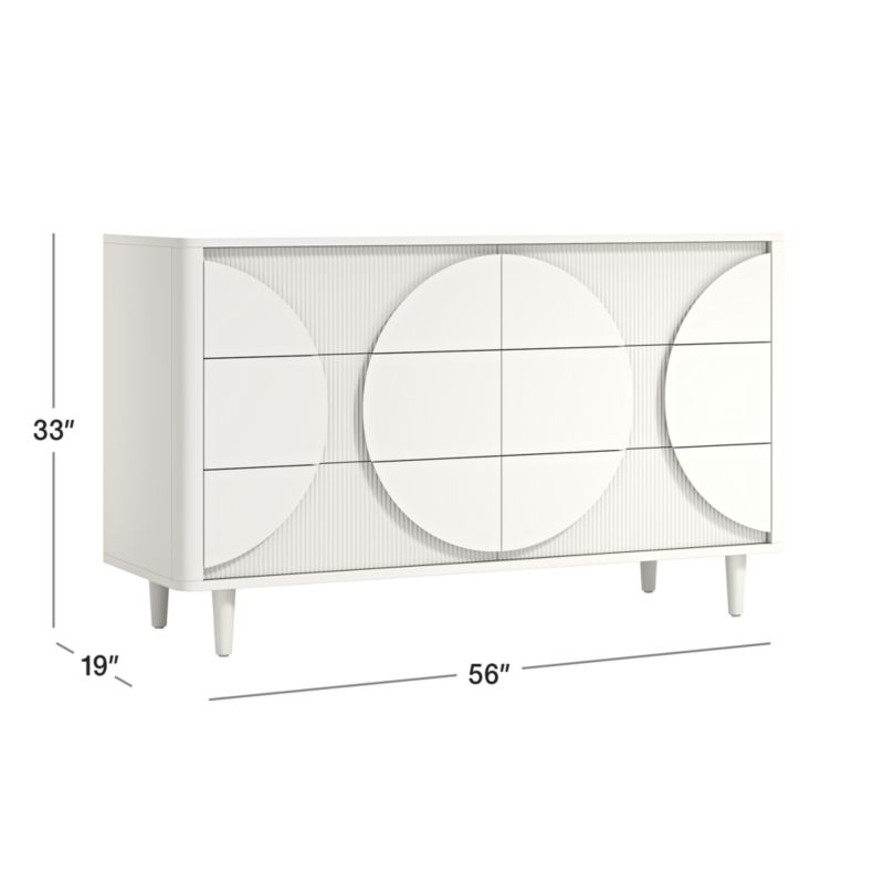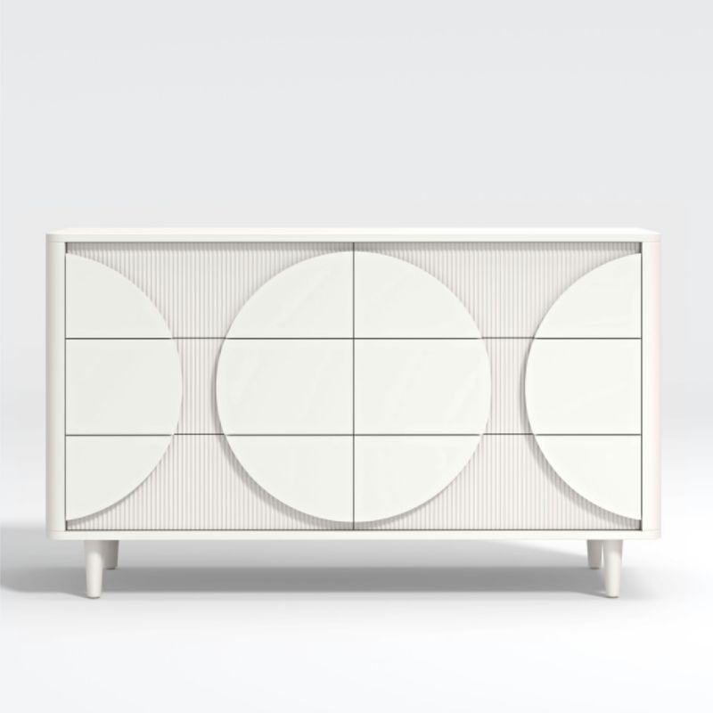 A playful take on 1930s glamour. Painted creamy white, our Roselle Wide White Wood Dresser boasts plenty of unexpected details for young design lovers. The reeded drawers offer texture, rhythm and a delightfully retro feel, while the clean curves and smooth sides keep the look fresh. Ultra-oversized circles serve as whimsical handles for the six drawers. Part of our Roselle collection for baby nurseries and big-kid rooms, the Wide White Wood Dresser is a Crate and Kids exclusive.