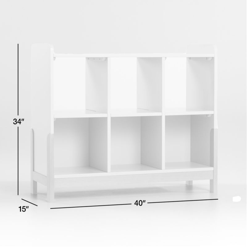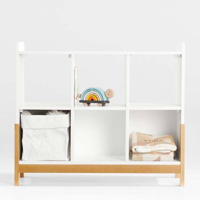 With a compact horizontal design and modern-two tone look, our Rue 6-Cube Low Bookcase is a versatile decluttering essential. The cool, neutral hue is perfect for boys or girls nurseries and kids rooms, and the natural oak legs add warmth and texture. Situate the bookcase against a wall or in a corner, or fit it into kid nooks and alcoves. The three compartments are designed to accommodate our cube storage containers, allowing for easy organization and quicker clean-up times. Plus, you can display their favorite toys, kids decor and books along the top.
